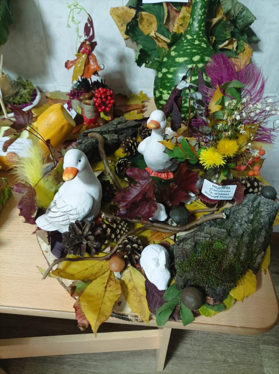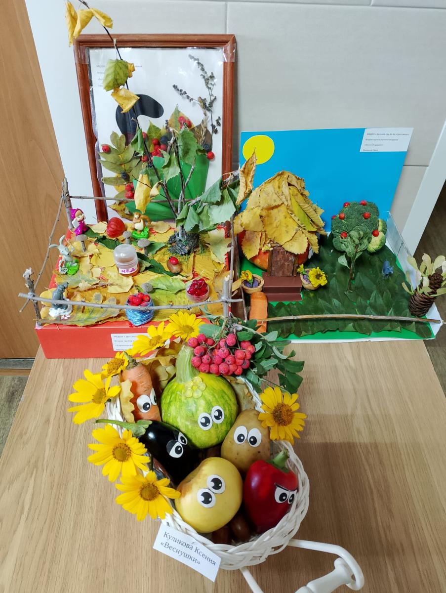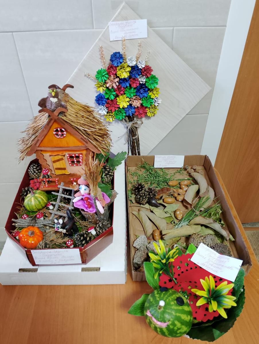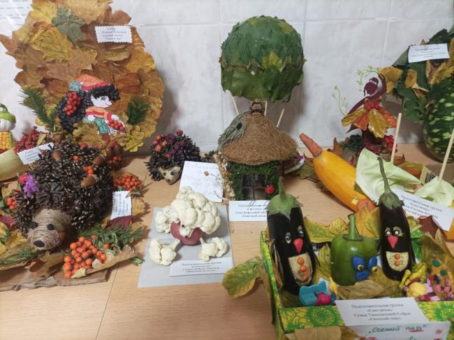 Осень – это самая живописная пора года. С приходом осени мир наполняется яркими красками, словно волшебница разукрашивает каждый листик акварелью. Цвета переплетаются между собой, создавая прекрасные сказочные пейзажи. В период золотой поры в нашем детском саду стало традицией проводить выставки совместных работ родителей и детей (поделок из природного материала, овощей, фруктов - «Краски осени»). Такие мероприятия сближают родителей и ребёнка, позволяют им не только выразить свой творческий потенциал, но и демонстрировать свои таланты, воспитывать добро и человеческое отношение к окружающему миру, развивать семейное творчество! На выставке были представлены работы детей, созданные совместно с родителями. Для создания неповторимых шедевров использовались дары осени – овощи, фрукты, сухоцветы, шишки, веточки, ягоды. Все работы оригинальны, неповторимы и выполнены со старанием и любовью, несут в себе тепло и доброту. В каждой работе прослеживается творческая индивидуальность и фантазия каждой семьи.