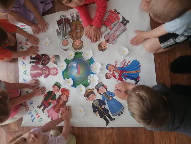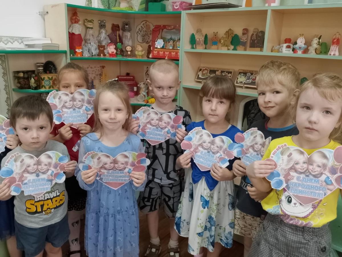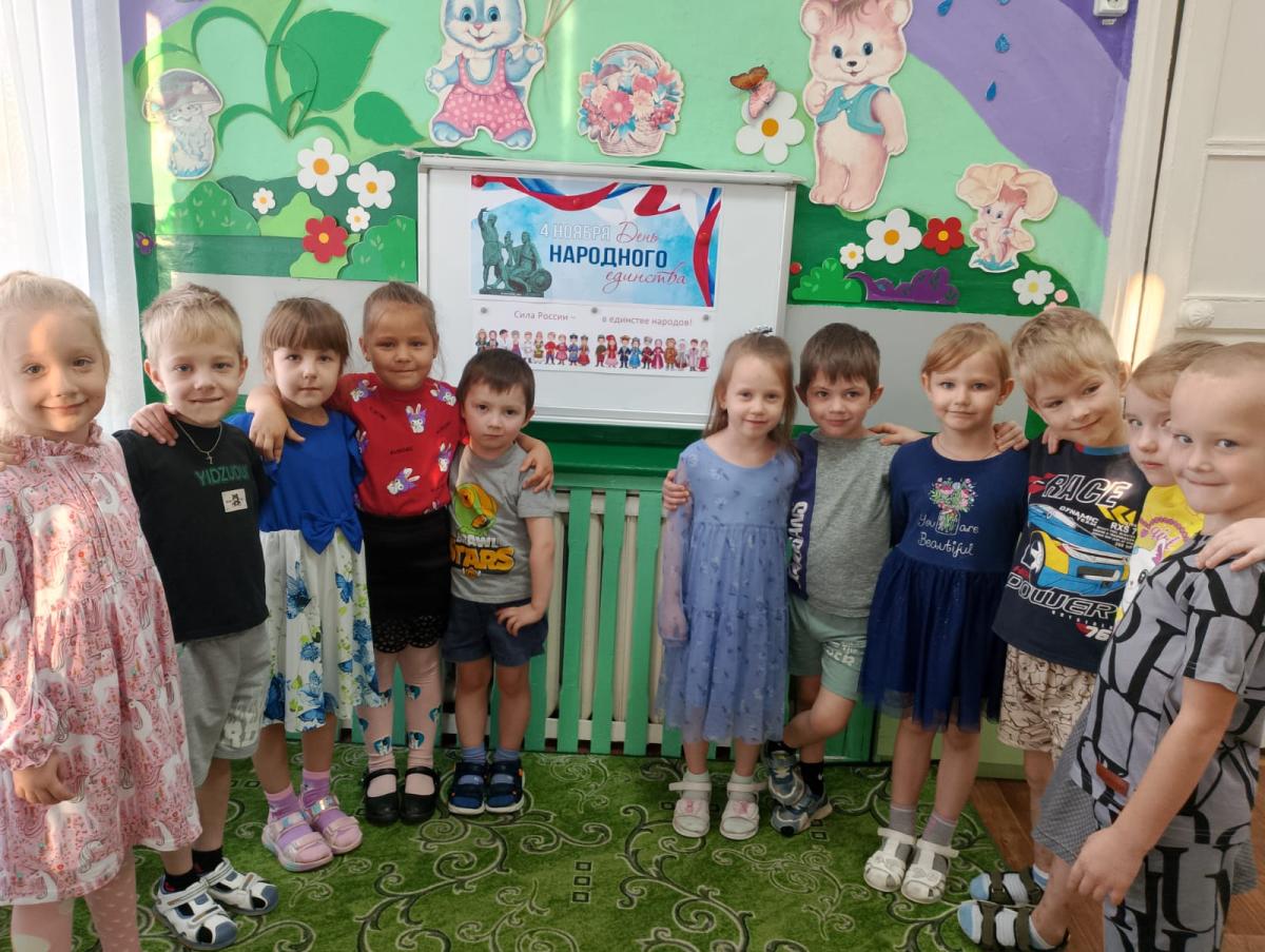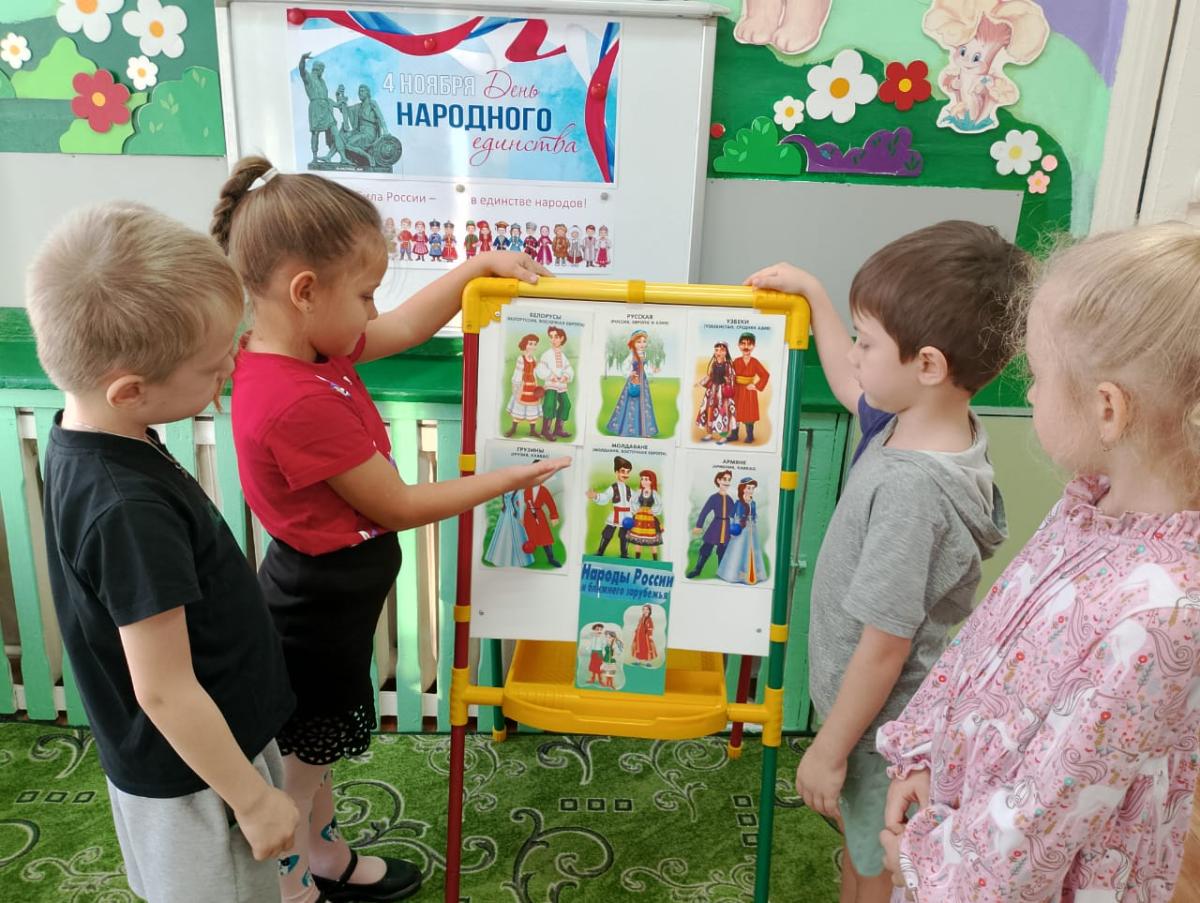 В преддверии праздника "День народного единства" в детском саду прошли тематические мероприятия. В доступной форме воспитанники познакомились с историей возникновения праздника, подвигами наших предков во имя независимости Родины. Ребята узнали о том, как велика и красива наша Родина, как богата событиями еë история, закрепили свои знания о государственных символах. Мы старались донести до детей значение слов "дружелюбие" и "взаимовыручка", желание помогать друг другу, быть терпимыми и уважать интересы других. Сила России в единении всех наций и народностей, и потому задача нас, взрослых, заложить основы дружеских отношений в сердца наших детей с ранних лет. Ребята познакомились с национальными костюмами народов России, играли в игру " Найди и раскрась флаг России", посмотрели презентацию об истории возникновения праздника, читали литературные произведения о дружбе, пели песни о Родине, танцевали и играли в народные игры, а также своими руками изготовили поздравительные открытки и вручили их своим близким.